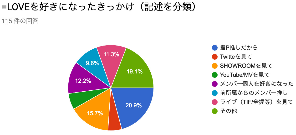 ①「=LOVEを好きになったきっかけ」 と ②「=LOVE以外に好きなのは?」という設問、そして③「ファンの方との応答」を含めての類推となります。